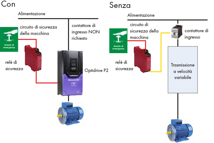Optidrive P2 è dotata di una funzione di disattivazione coppia in sicurezza, che permette una semplice integrazione nei circuiti di sicurezza critici della macchina.